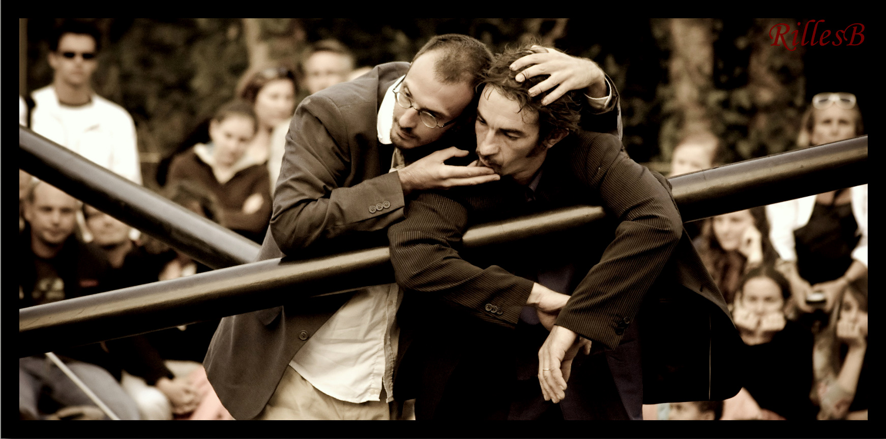 Le Filet d’Air: Isabelle et Fabien/Enji WADEL, Bertrand LANDHAUSER, sotto lo sguardo di Les Colporteurs dialogano appesi a un filo in