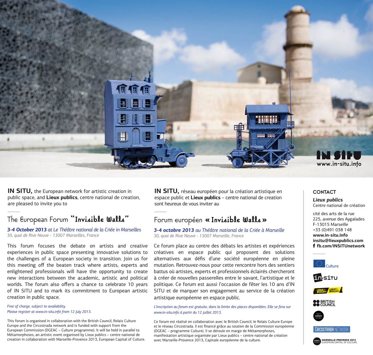 Forum realizzato in collaborazione con il British Council, Relais Culture Europe e il network Circostrada. È finanziato grazie al sostegno della Commissione Europea 8DGEAC . programme Culture). Si svolge parallelamente a Métamorphoses, manifestazione artistica organizzata da Lieux publics – centro nazionale di creazione in collaborazione con Marseille-Provence 2013, Capitale europea della cultura.